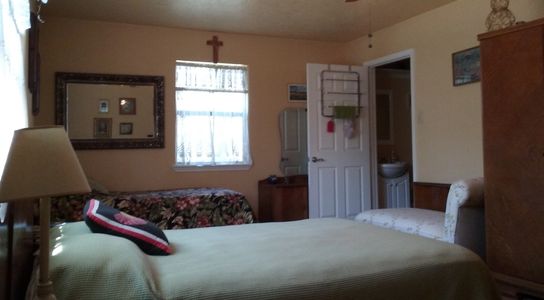 Bernie's suite is furnished with a chaise lounge sofa and a king size bed, Bernie's room overlooks the meditation gardens to the East and our experimental gardens to the South. Room includes personal TV, refrigerator and bathroom.