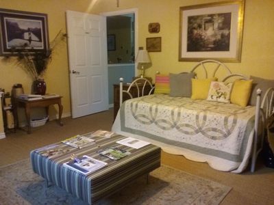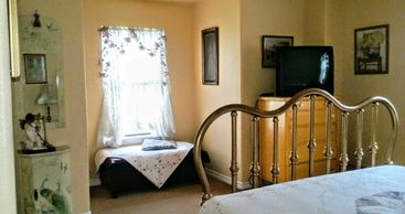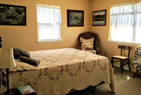 Eric's suite has a queen size bed, and a sleeper couch. Windows provide views of the grounds of both the experimental gardens to the South and our pond to the West. Shared bathroom.
