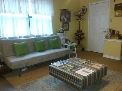 Furnished with 1 day bed, a sofa/bed, workstation and an entertainment center. Western view of our pond.